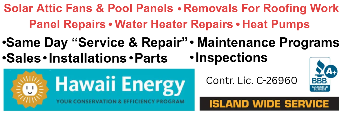 Island Solar Service is a highly experienced team of solar thermal professionals that has been in business for 27 years. When you’re looking for professional solar contractor that can perform professional and competitively priced work on Oahu, count on us at Island Solar Service. Give us a call for more information or to schedule an appointment at (808)833-1000.